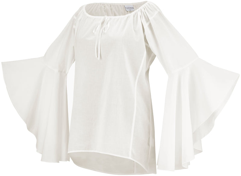 Angeline is a lightweight tunic-style top with a drawstring neckline (pulled together by a length of ribbon) and romantic fluttery bell sleeves. The sleeves are a special feature created to add a more angelic or fae look to the tunic, giving your arms their own set of small “wings”.