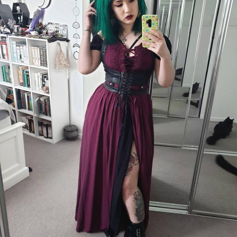 The wonderful thing about the Brigid Maxi overdress is that it can be laced up in the front and back. There's so much wiggle room in this design that people of all our listed sizes should have no issues flourishing in this gown.