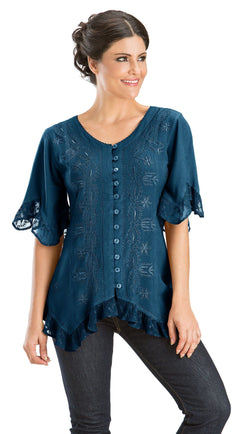 - Butter-soft, breathable rayon with lace trim.